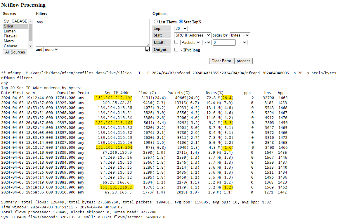 Acá adjunto una captura de NFSEN donde se ve que casi el 33% del tráfico total de SILICA que tuve anoche (de 19 a 24hs) es todo de esta CDN